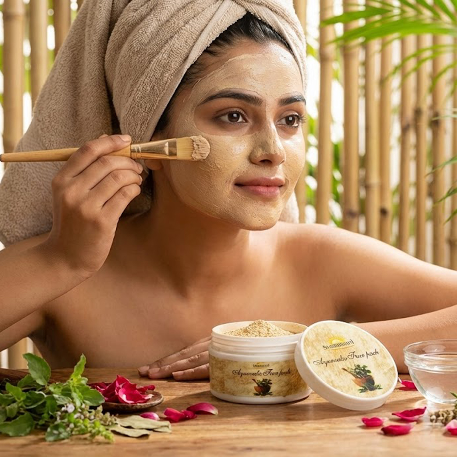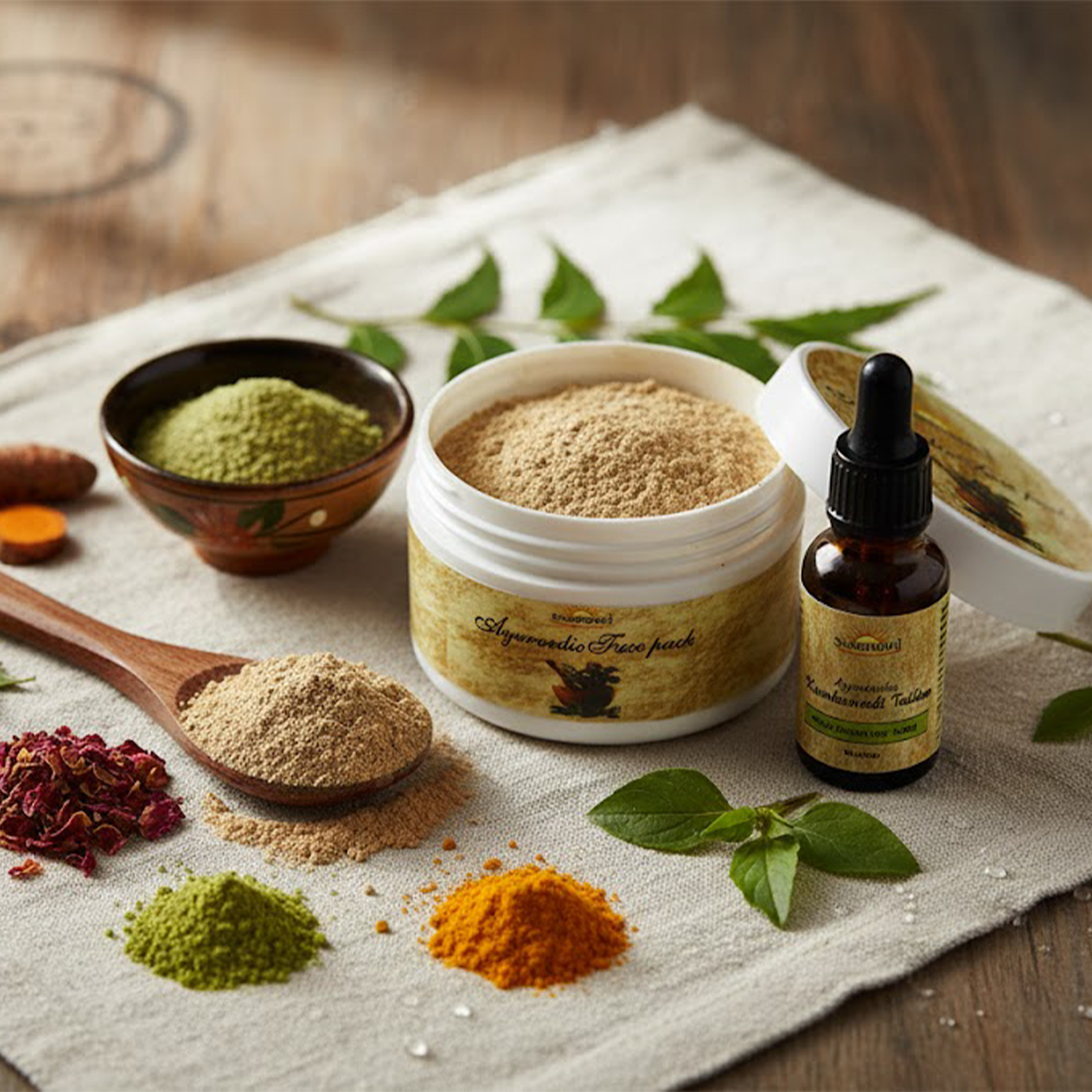 An Ayurvedic face pack is a traditional herbal powder blend used in cosmetic and personal care routines. It is applied externally and washed off after a short duration as part of regular cleansing practices.