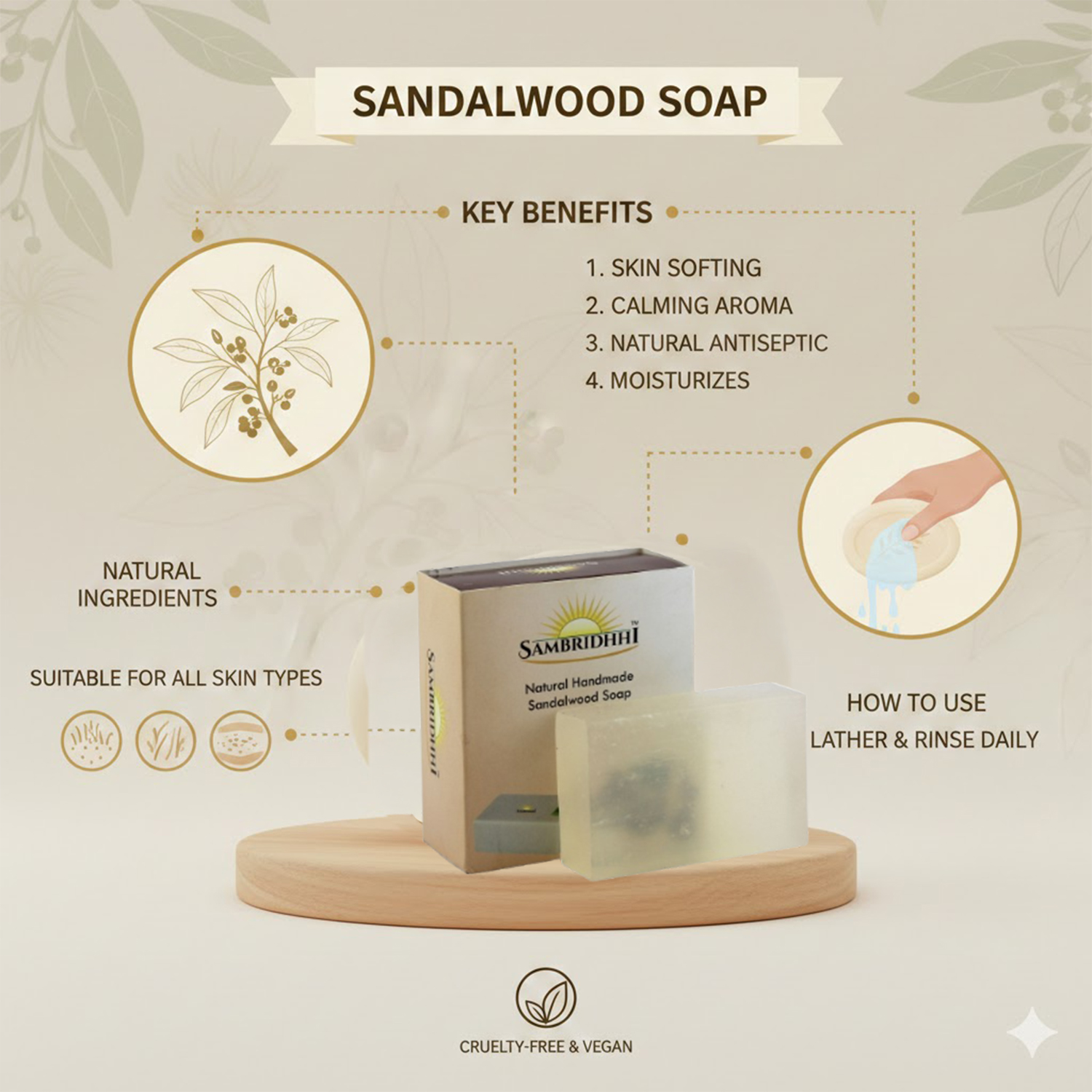 • This is a natural and handmade soap bar with natural, mild and heavenly fragrance of sandalwood