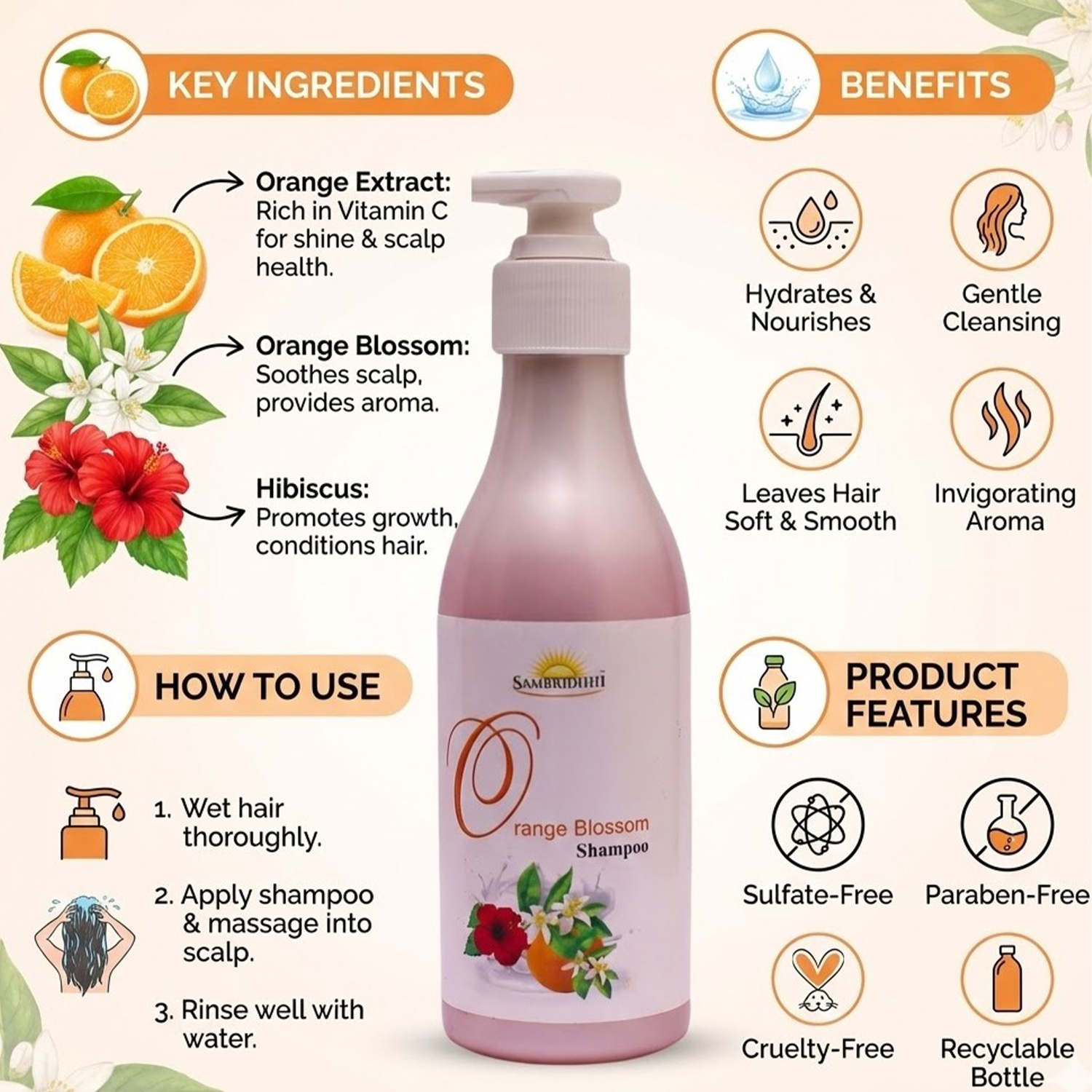 - Sambridhhi Orange Blossom shampoo is herbal shampoo with perfect combination of orange and hibiscus extracts.