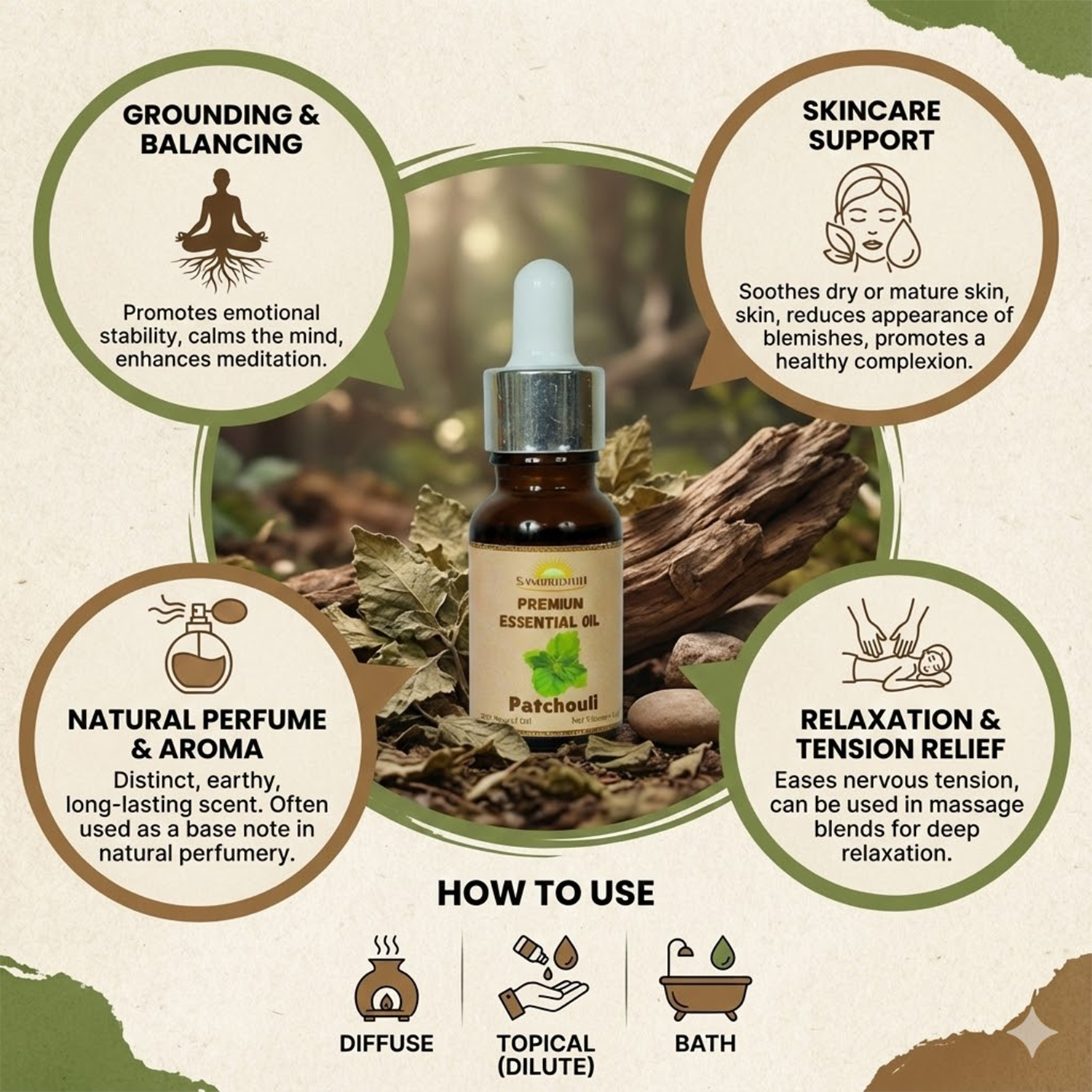 When properly diluted, pure patchouli essential oil can be safely used as part of relaxation and wellness routines.