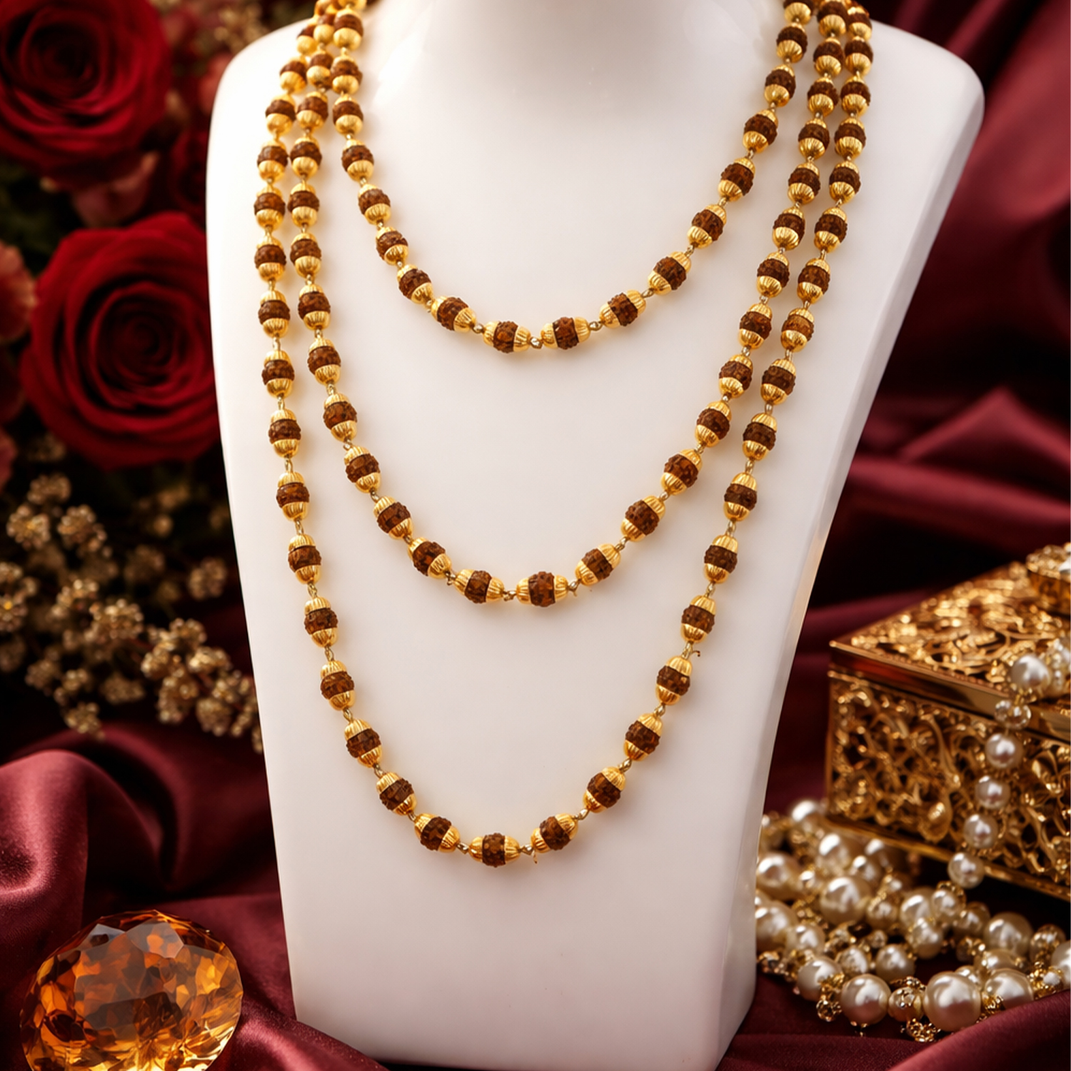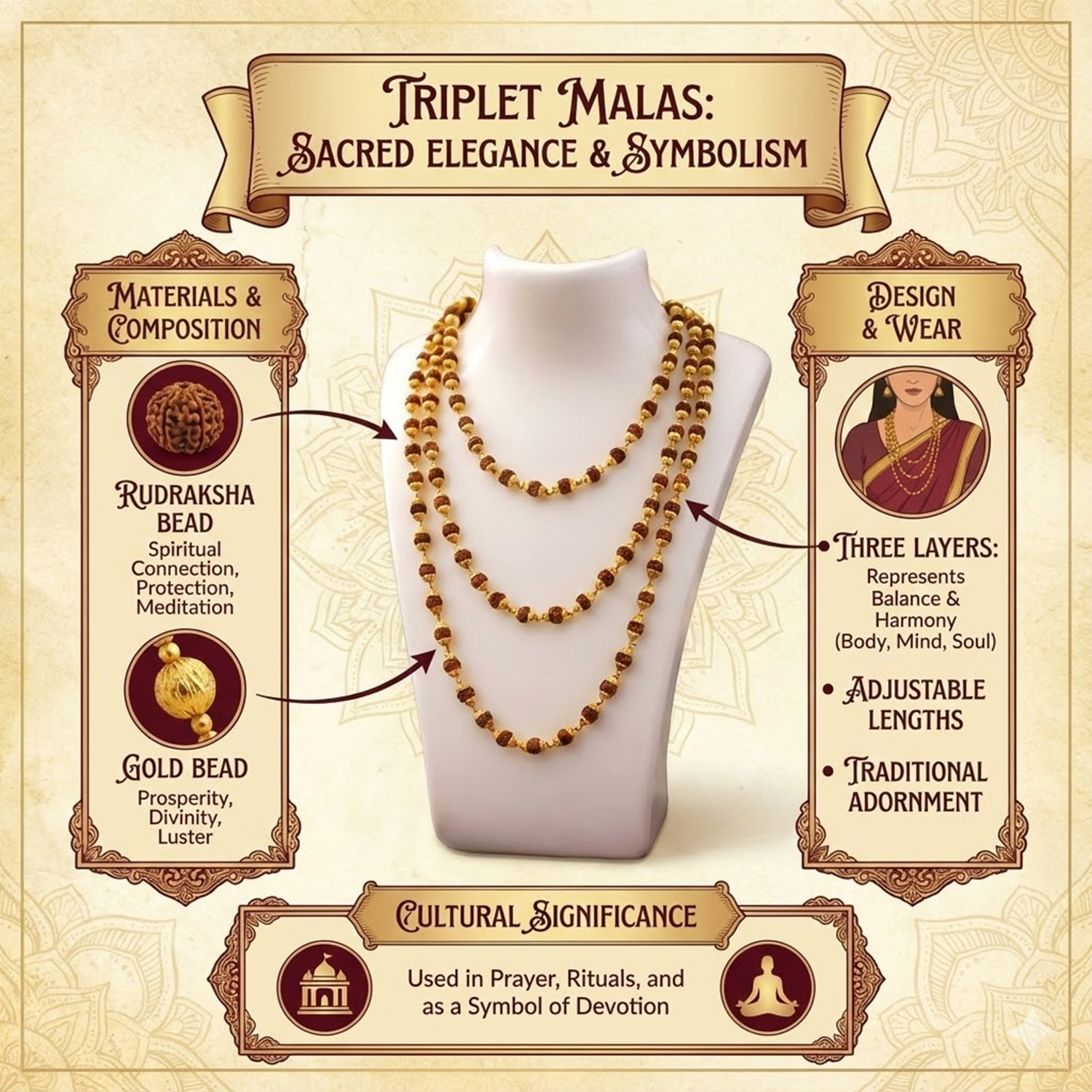 Triplet malas offer a layered representation of devotion while adding a refined aesthetic suitable for ceremonial and spiritual wear.