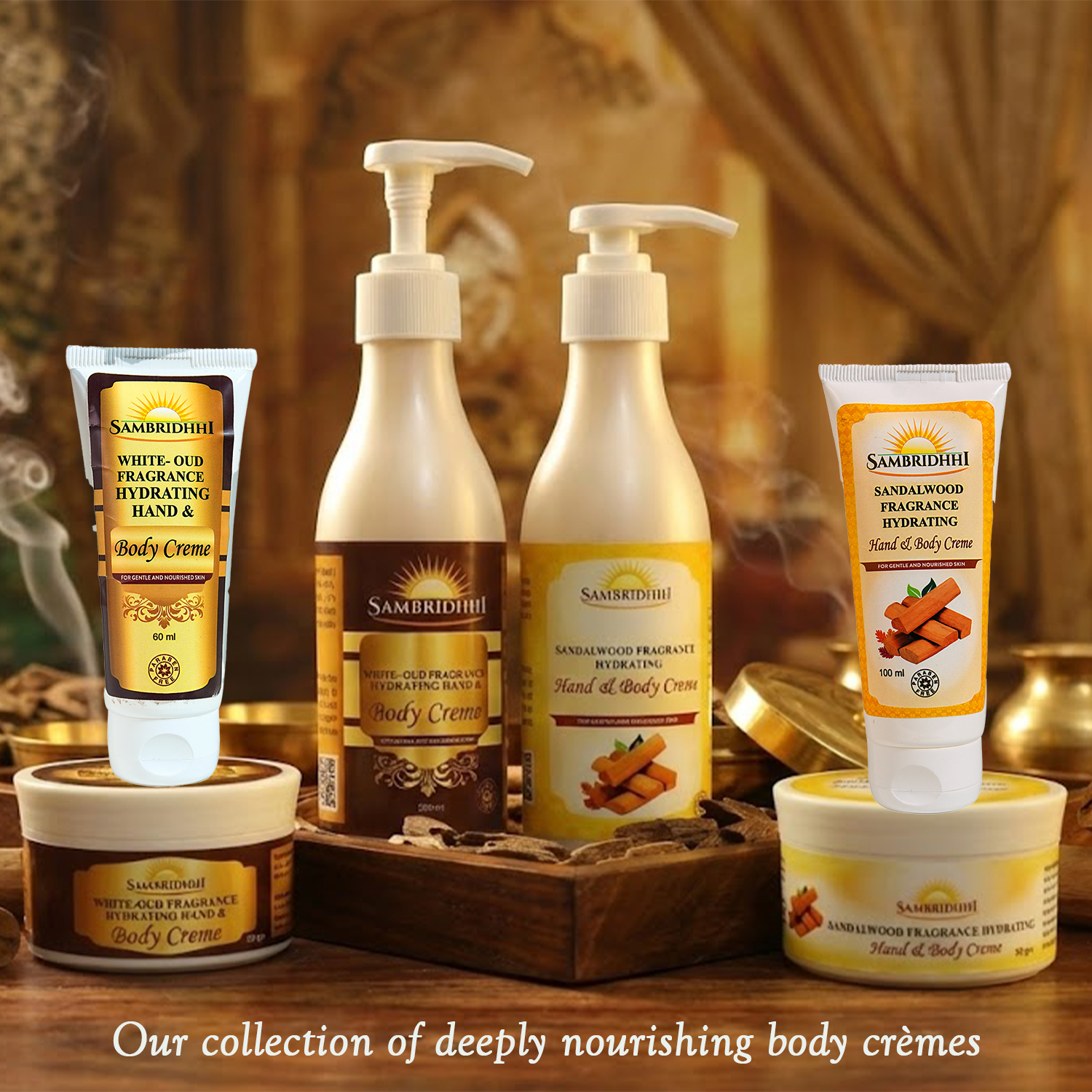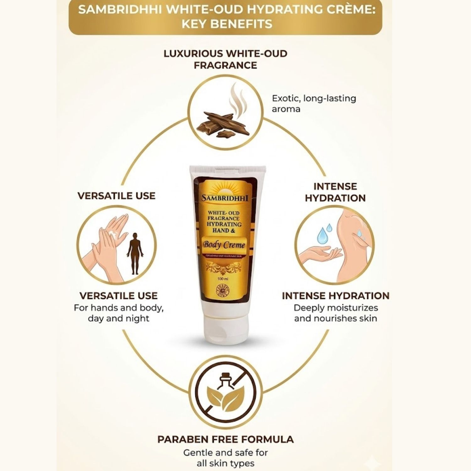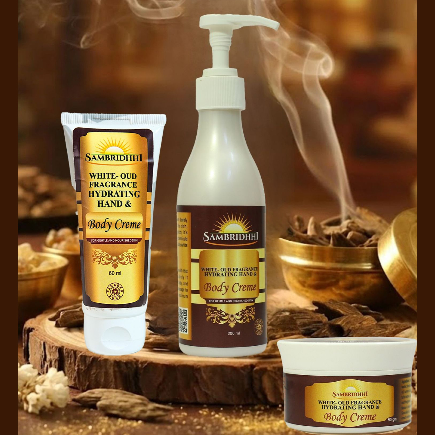 Sambridhhi’s White Oud Fragrance Hand & Body Lotion Crème is a luxurious blend of natural ingredients like aloe vera, shea butter, coconut oil, and botanical extracts. It provides deep hydration, soothes dry skin, and leaves a silky-smooth finish. Infused with the captivating aroma of White Oud, this lightweight, non-greasy lotion nourishes, rejuvenates, and protects your skin while offering a refreshing sensory experience. Perfect for daily use on all skin types.