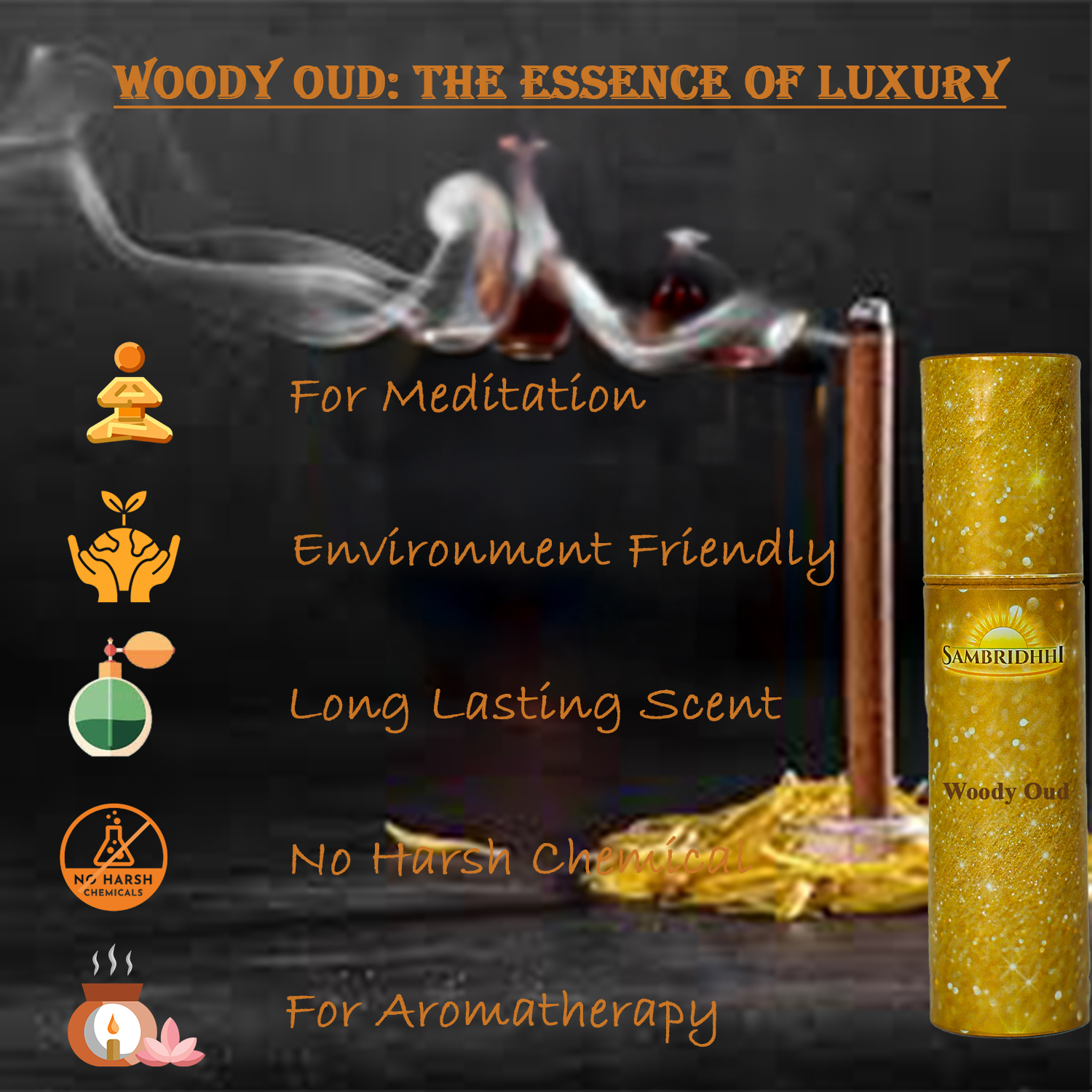 Sambridhhi’s Woody Oud Bambooless Dhoop – 60gm is designed for those who prefer a refined, traditional fragrance without bamboo sticks. Oud, also known as agarwood, is valued for its warm, grounding aroma that enhances spiritual and meditative spaces.